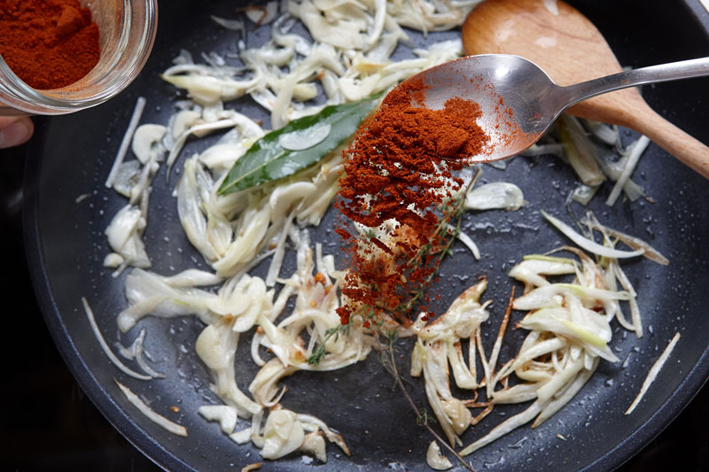 2. Se cortan las cebolletas en tiras finas y se laminan los dientes de ajo pelados y se sofríen diez minutos, a fuego suave, en la misma sartén. Se incorporan el tomillo, el laurel, el pimentón y la cayena y le damos unas vueltas.