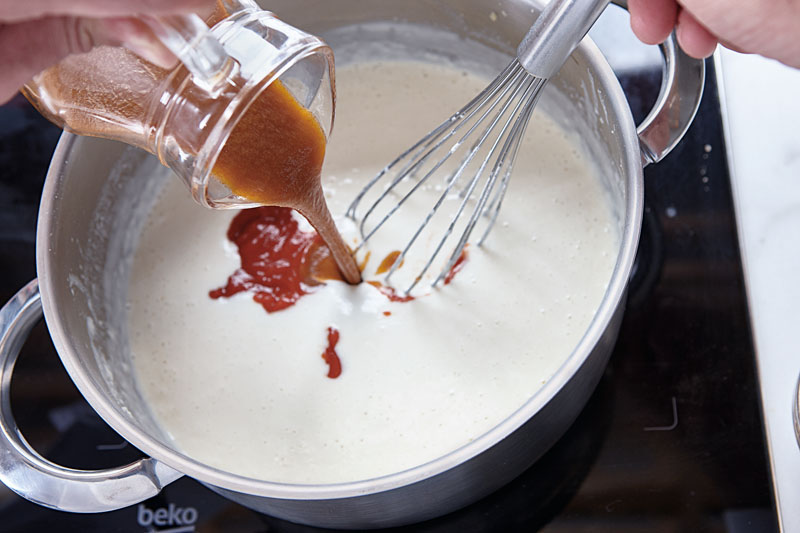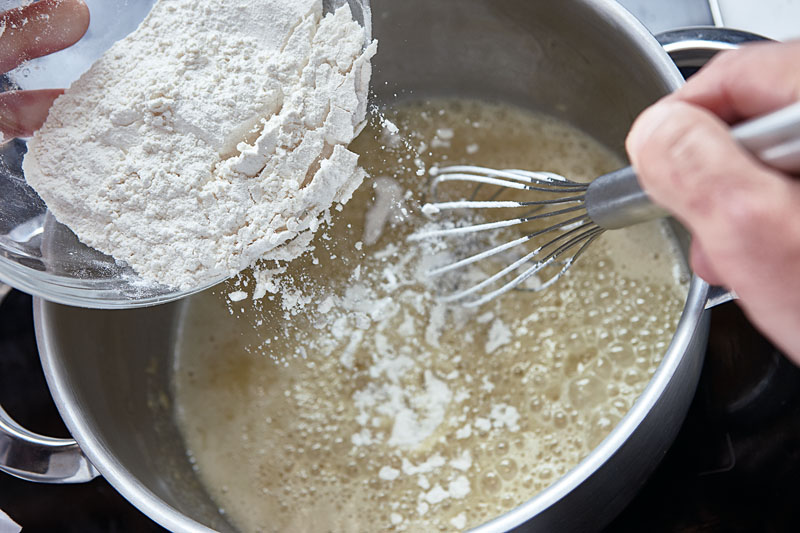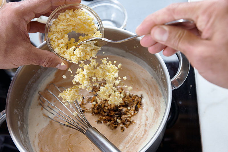 olla. Se agregan la leche y la nata hervidas de a poco, sin dejar de
