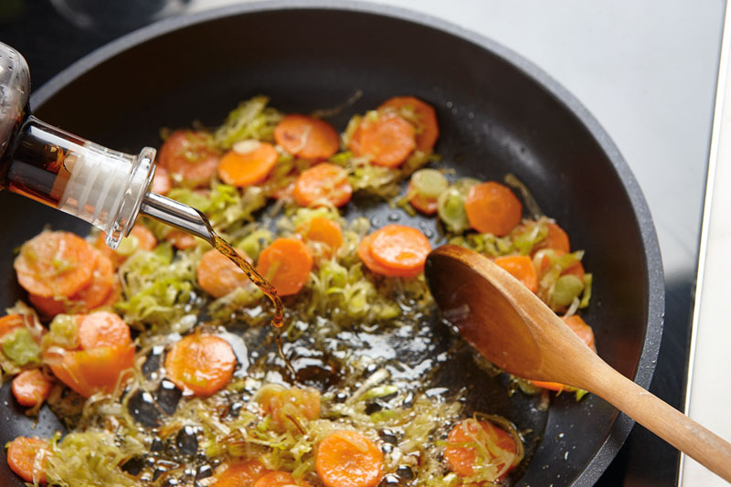 3. Para el salteado, en una sartén sofreímos con aceite y sal la zanahoria y el puerro.