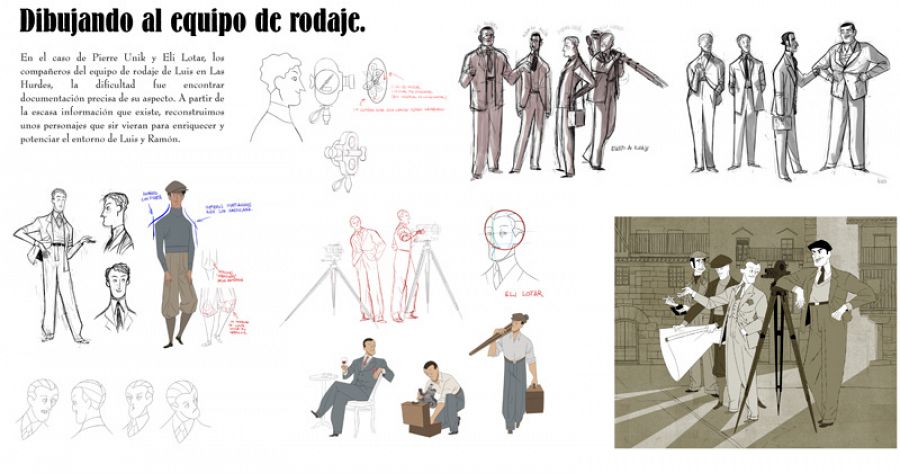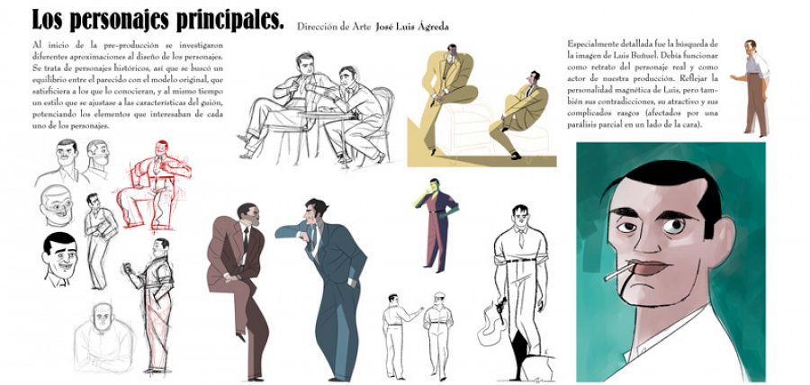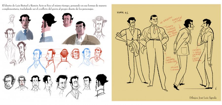 Diseños de los personajes de Buñuel y Ramón AcínEn cuanto al diseño de ambos personajes: “Se intentó que hubiera los suficientes elementos reconocibles para identificar a Buñuel y a Ramón -nos
