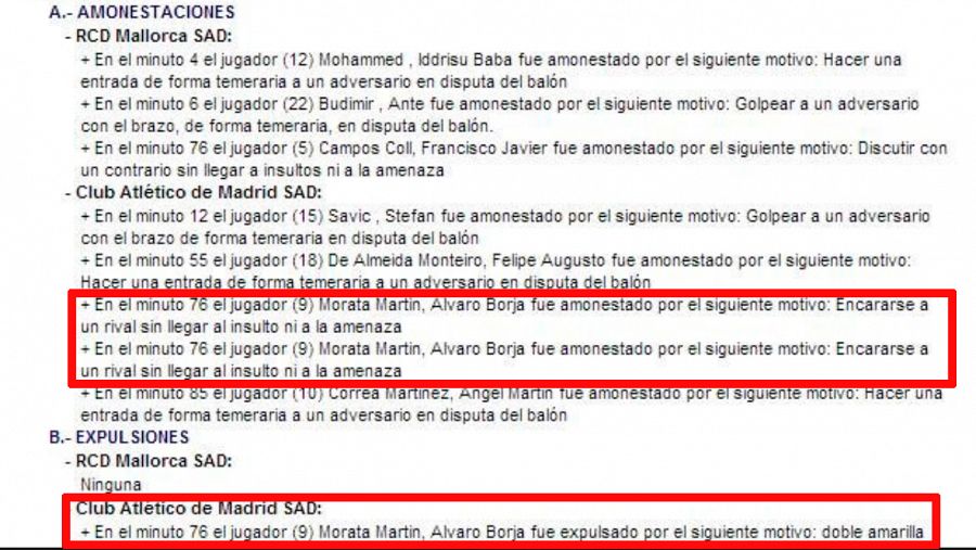 Acta arbitral del partido Mallorca - Atlético, en el que está reflejada la expulsión de Morata. noticias