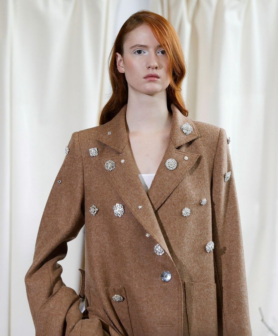 Destaca el trabajo artesano que hay detrás de las prendas. Dalbat ha recuperado técnicas de bordado a mano sobre bastidor que combinan pelo de mutón y apliques de cristales y cuarzos,