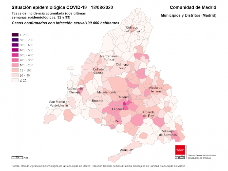 La Consejería de Sanidad no ha aclarado las zonas donde aconsejan quedarse en casa. No obstante, la Comunidad de Madrid identifica el sur de la región como la zona de mayor tasa de contagios y por ello ha seleccionado para desarrollar las pruebas aleatorias de PCR los distritos madrileños de Carabanchel, Usera, Villaverde y Puente de Vallecas, así como las localidades de Alcobendas, Móstoles, Parla y Fuenlabrada.De esta manera, los distritos del sur de la capital son los más azotados. En cuanto a la tasa de incidencia acumulada durante las dos últimas semanas de casos confirmados con infección activa (hasta el 18 de agosto, fecha en la que la Comunidad de Madrid aporta los últimos datos), las zonas con mayor incidencia son Usera (334 casos / 100.000 habitantes), Villaverde (222 casos / 100.000 habitantes), Puente de Vallecas (208 casos / 100.000 habitantes) y Carabanchel (199 casos / 100.000 habitantes).