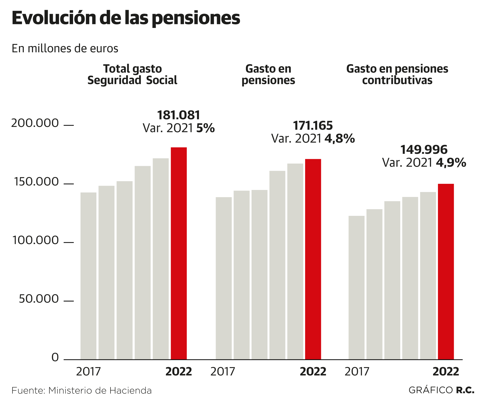 Las cotizaciones sociales no son suficientes para pagar el abultado gasto en pensiones que soporta el sistema público español y que supone un total de 171.165 millones de euros para 2022. Ni siquiera en un año en el que la recaudación por estas cuotas subirá un 9%, impulsada por el crecimiento del PIB y, también, por un encarecimiento del 1,7% de las bases máximas de cotización, según consta en el proyecto de Presupuestos Generales del Estado (PGE) presentado ayer en el Congreso. Con lo que se recogerá de trabajadores y empresarios solo se financiará un 75,3% de las actuaciones de la Seguridad Social para 2022.