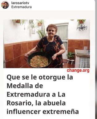 Unidas Extremadura ha creado una petición en la plataforma change.org -que actualmente cuenta con 312 firmas- para que todos puedan votar y apoyar a La Rosario en esta nueva aventura. En la publicación, la coalición política refleja que «comenzó a publicar vídeos durante la pandemia, ayudada por su nieto, como una forma de superar, a través del humor, el difícil momento que la sociedad estaba viviendo y que afectó especialmente a las personas mayores. De hecho, en muchas de las innumerables entrevistas que ha realizado siempre ha manifestado que el principal motivo por el que sigue grabando vídeos es para reivindicar el papel fundamental de los abuelos en nuestras vidas».