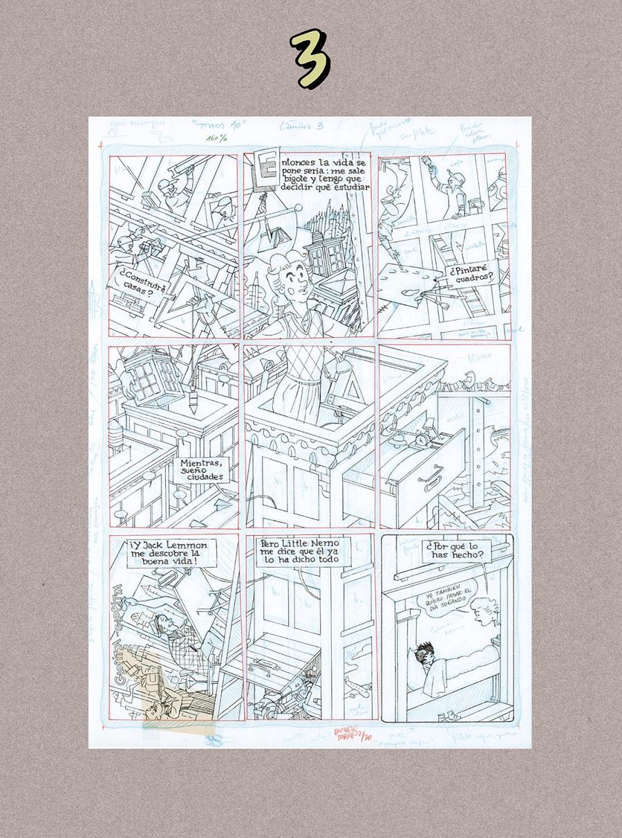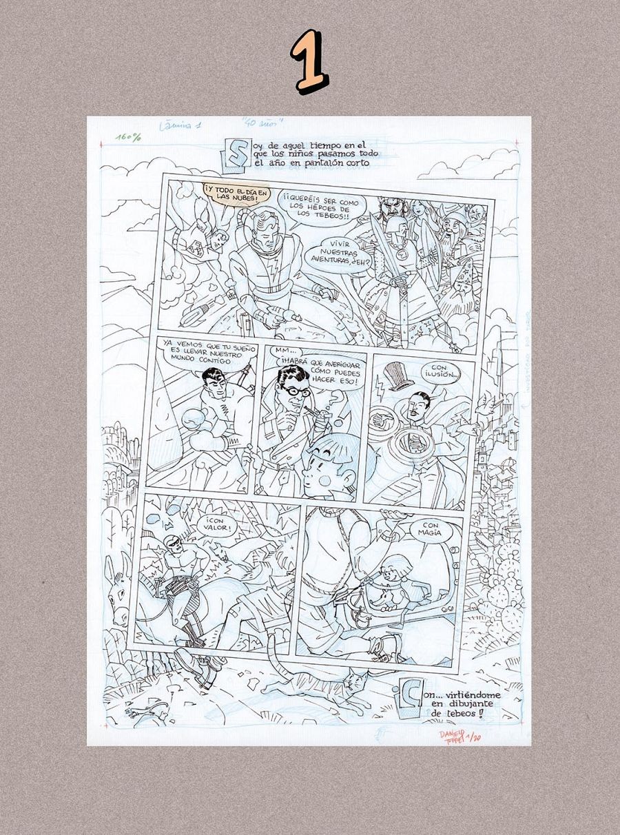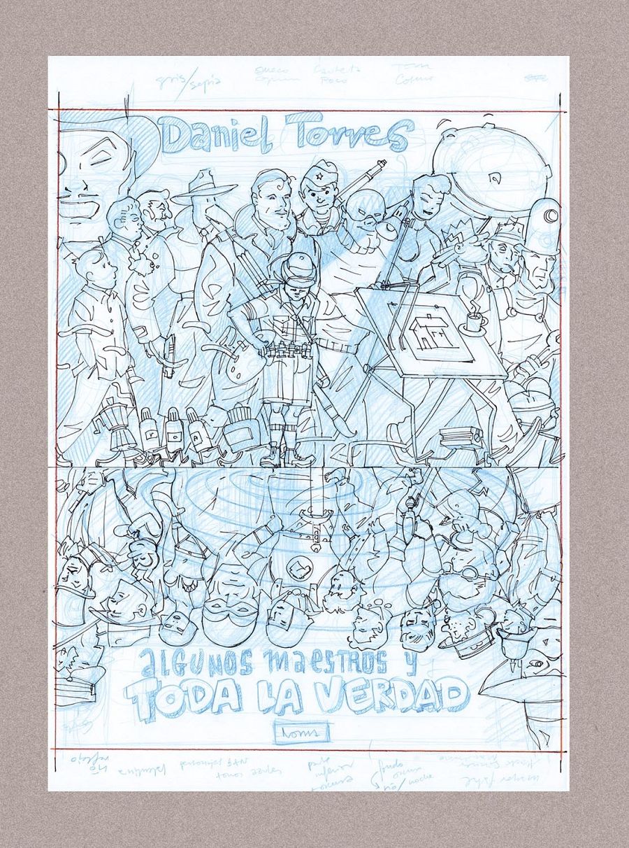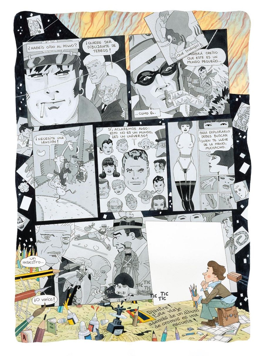"Si te fijas -continúa-, verás la gran variedad de autores, de personajes y estilos de los que uno aprende. Además, me gustaría aclarar que cuando yo era joven no había escuelas en las que se pudiera estudiar narración gráfica, como afortunadamente pasa actualmente. Eso quiere decir que obligatoriamente éramos todos autodidactas. Eso tiene ventajas y desventajas, porque vas estudiando todo lo que cae en tus manos y decides si de ahí puedes aprender algo o no. Por eso este libro es un homenaje a esos maestros de los que aprendí prácticamente todo lo que sé de cómic e ilustración. No se puede ocultar de donde vienes. Y el lenguaje de Daniel torres viene de estos autores de los que aprendí y que posteriormente asimilé hasta crear mi estilo propio y personal".