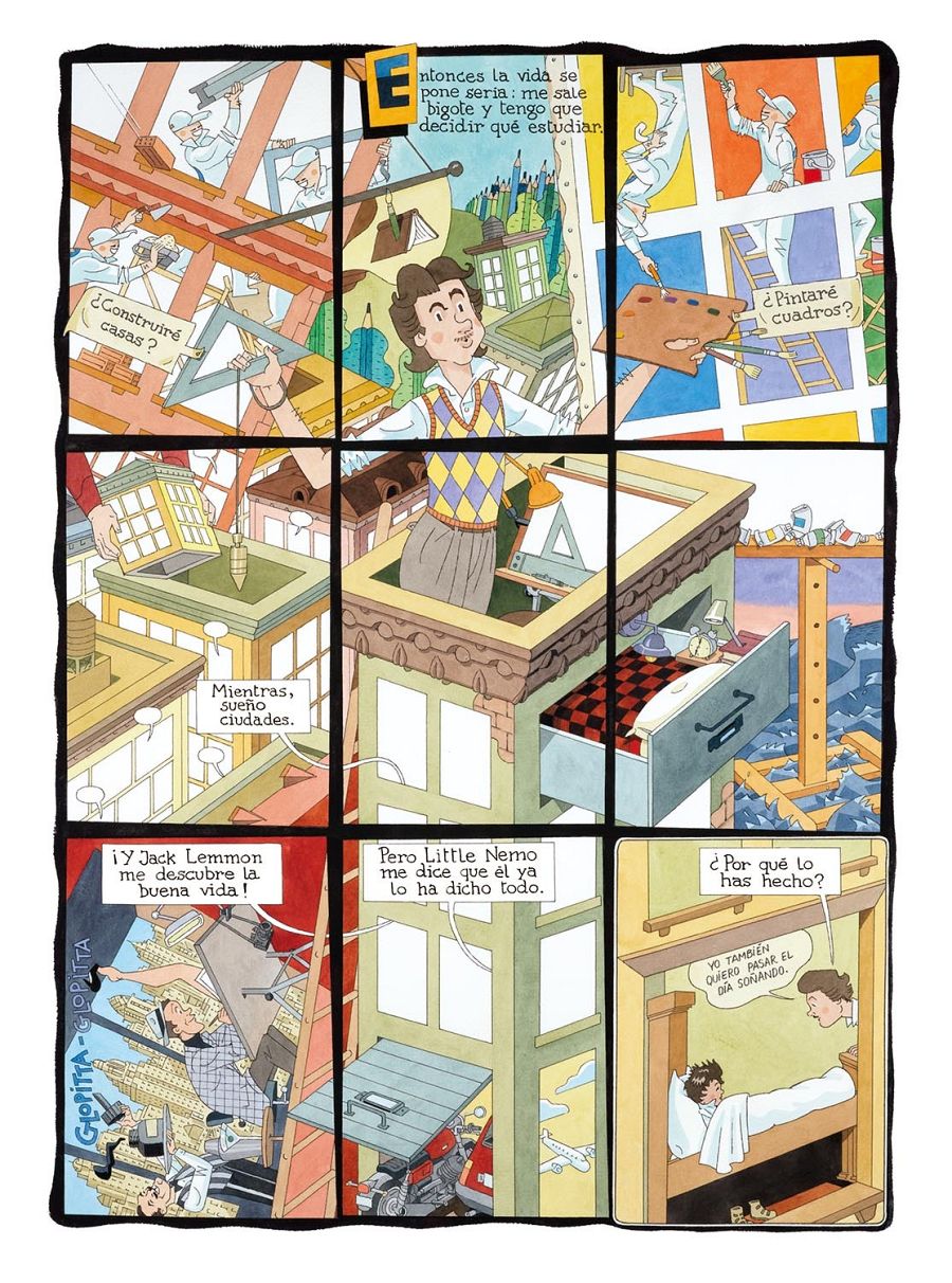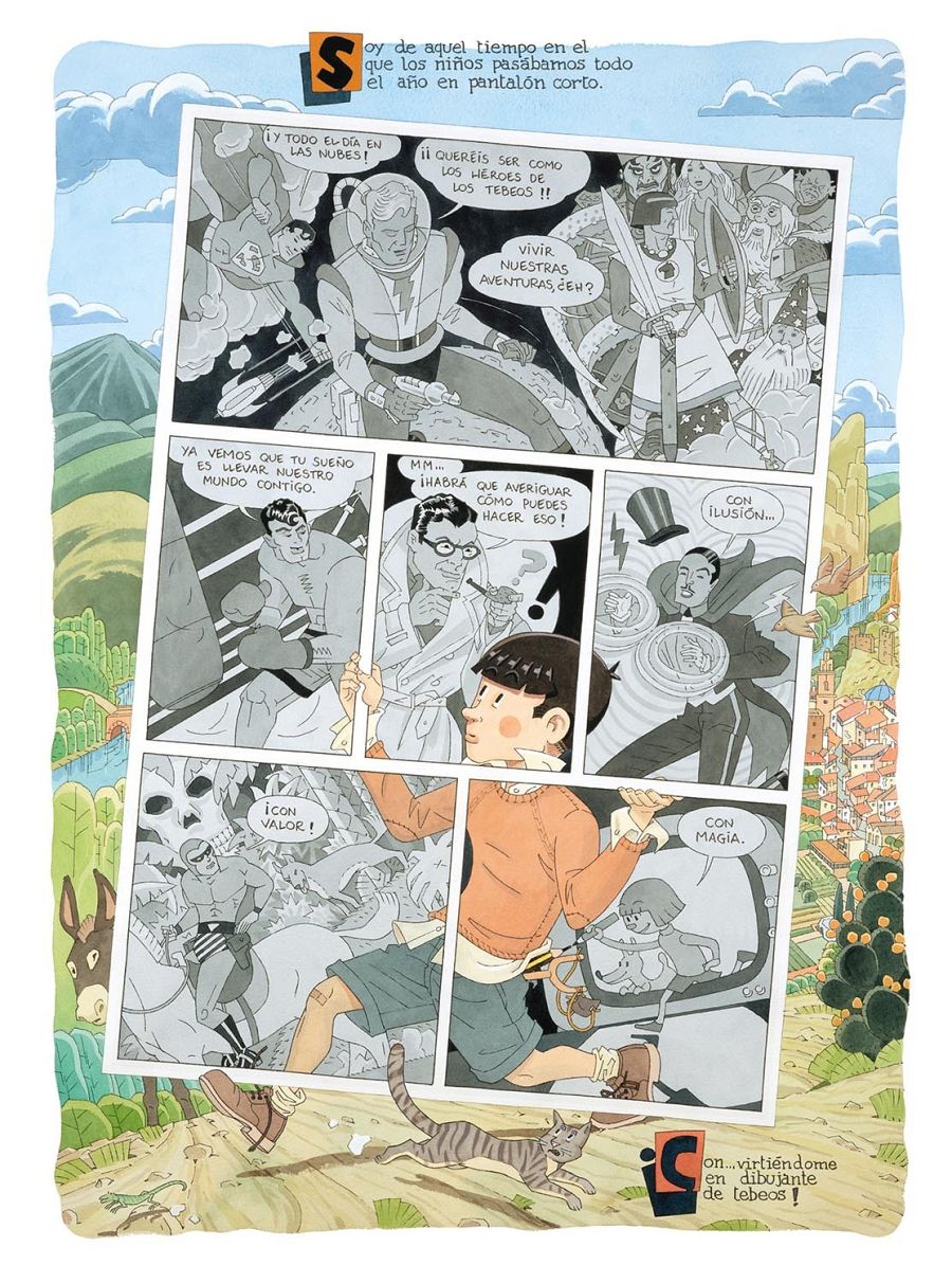 "Por eso los originales de las ilustraciones del libro son tan grandes, como 60 o 70 centímetros, porque cuentan muchas cosas y están llenas de detalles -añade-. Lo fundamental es que una ilustración te atrape. Y eso es lo que intento, que puedas hacer una lectura rápida de la imagen pero que luego puedas volver a ella descubiendo segundas lecturas y apreciando todos los detalles".
