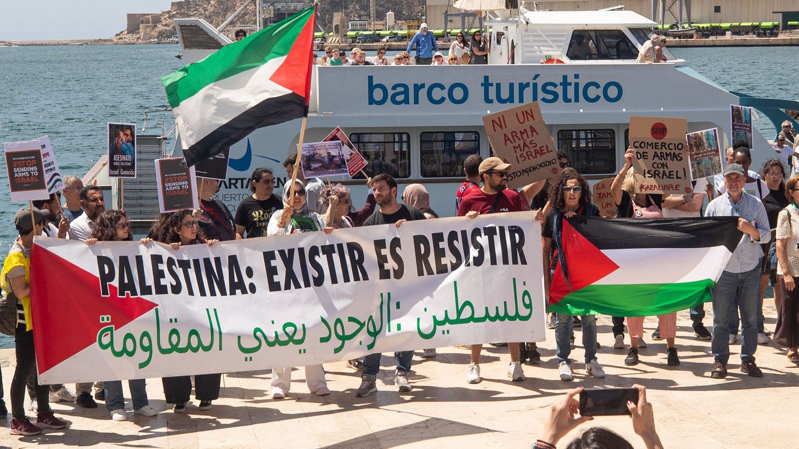 Una de las portavoces de Palestina Libre Región de Murcia, Encarna Aguirre, ha anunciado que, junto al Colectivo de Murcia en apoyo al Boicot, Desinversión y Sanciones (BDS) contra la ocupación israelí, han convocado este mediodía una concentración ante la sede de la Autoridad Portuaria de Cartagena en la que harán entrega por registro de un escrito en contra de que entre un carguero con armamento en el puerto de Cartagena.